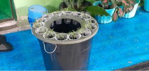 Dia menambahkan, dengan pola itu, tidak membutuhkan halaman dan tempat yang luas untuk kolam. Cukup ember ukuran agak besar kira-kira 85 liter, ditambah gelas plastik untuk media tanam. Lalu, kenapa Ikan Lele yang dipilih. Tentunya karena perawatan relatif mudah dan tahan kondisi air apapun. Sedangkan Kangkung, mudah tumbuh saat dekat dengan air. Oksigen untuk ikan dapat diperoleh dari akar kangkung yang menjuntai di air, jadi bersifat simbiotik.