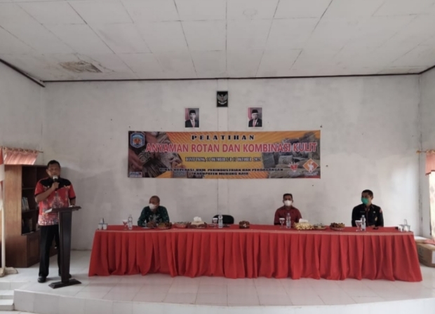 1tulah.com, PURUK CAHU – Pemerintah Kabupaten Murung Raya (Mura) melalui Dinas Koperasi UKM Perindustrian dan Perdagangan (Diskop UKM Perindag) setempat melaksanakan pelatihan anyaman rotan dan kombinasi kulit bagi pengrajin lokal. Kegiatan selama empat hari mulai Kamis (14/10/2021) diikuti 15 pengerajin dari beberapa desa di beberapa Kecamatan bertempat di Desa Danau Usung, Kecamatan Murung.
